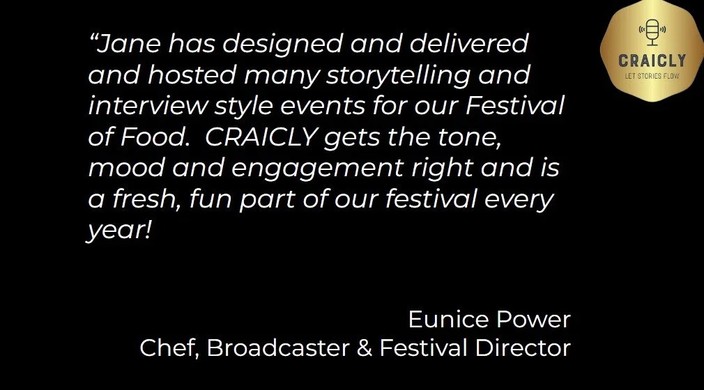 Jane is the CRAICLY founder and host and writer. As an experienced host, Jane can both design, script and co-ordinate a storytelling element to your festival or event requirements.
